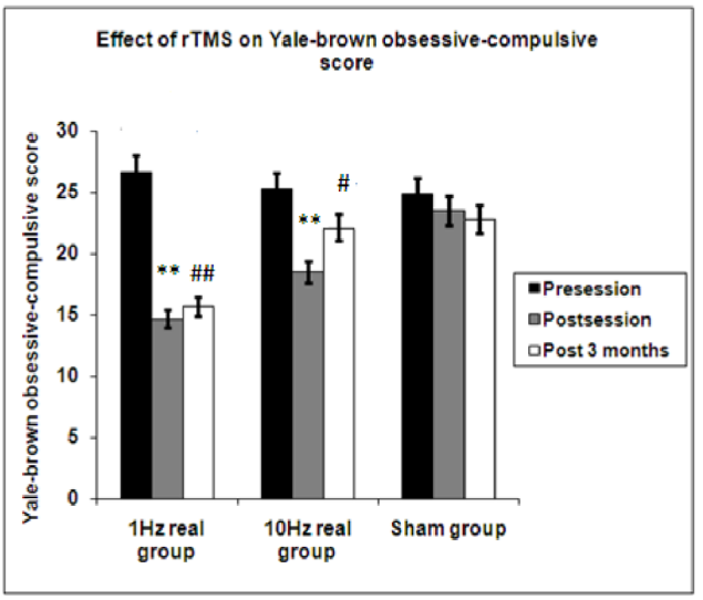 本研究中使用的主要測量系統是耶魯-布朗強迫癥量表 (YBOCS). 第1組患者在接受(1Hz)rTMS治療后,YBOCS評分顯著下降,并持續(xù)3個月。第2組患者在療程結束后接受10 Hz的治療,其癥狀得到顯著改善(P=0.004),但這一改善在3個月內沒有維持(P=0.174),而偽刺激組在療程結束后和3個月后均未記錄到任何變化。[1]